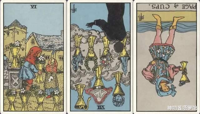 牌:圣杯六+ 圣杯七- 圣杯随从-