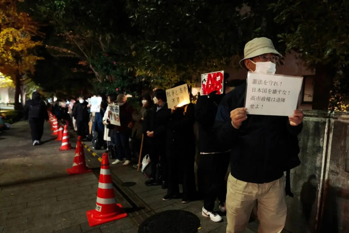 请愿民众高举标语,明确条款日本首相高市早苗就闯馆事件向中国矜重谈歉,请愿达成后,东谈主群依然皆声高喊:“看成日本国民,我谨代表我标的中国谈歉”,“高市早苗必须离职”的标语响彻街头。