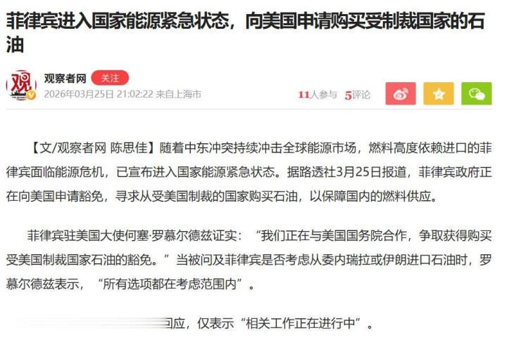 这可不是什么主不雅推测,而是真露馅切的生计危险。凭据新浪财经和网易等主流媒体征引的阛阓数据,由于中东地缘时局赓续垂危,全球动力供应链受到严重冲击,而菲律宾作为一个极其拉胯的群岛国度,原土简直莫得任何原油产能,杰出百分之九十的原油供应严重依赖从中东入口。现时的菲律宾,国内燃料储备仍是亮起了夺宗旨红灯,全部加起来只够守护直快四十五天的供应。