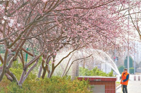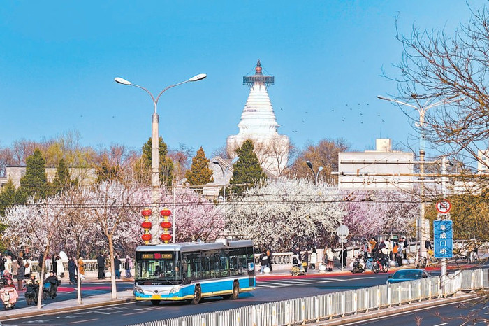 春意渐浓,二环边阜成门桥隔邻的桃花灿烂洞开,与边远的白塔交汇成画,好意思不堪收。盎然春意也招引了很多市民旅客前来拍照打卡。本报记者潘之望摄