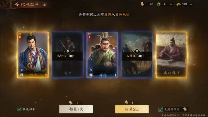 要证据的是,本作不再罗致武将转战法的野心,而是平直在卡池中抽战法,省去了许多繁琐的操作。另外游戏中战法也可以升星。