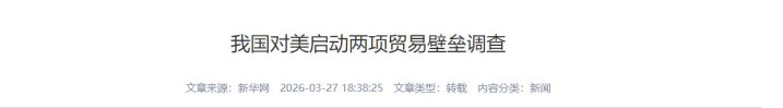 3月27号,商务部发布公告,就好意思国碎裂全球产供链相干作念法和方法,和好意思国顽固绿色居品交易相干作念法和方法,认真发起两项交易壁垒打听。